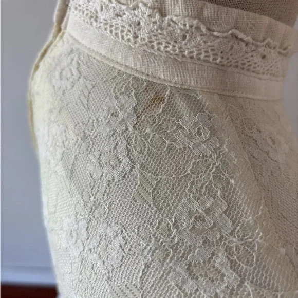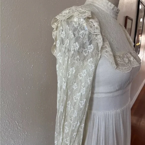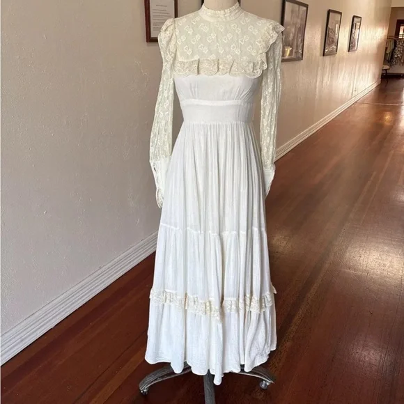 Gunne Sax Vintage Ivory Dress High Collar Prairie Cottage Core Sz 11Beautiful vintage condition ivory cream gauze & lace GunniesLace sleeves with cotton gauze cuffs with working zipper closuresMeasurements are approx:Total length shoulder to hem 54”28” waist32” bustMaterial tag is very faded but reads: 100% CottonLace 100% nylonLining 100% acetateThere are some minor flaws, considering it’s vintage 1970s,Id rate condition as very goodFlaws noted in pics:Some faint stains on back of neckA few small holes in outer layer gave from previous owners attempt at hemmingFeel free to ask any questions!! Thanks!